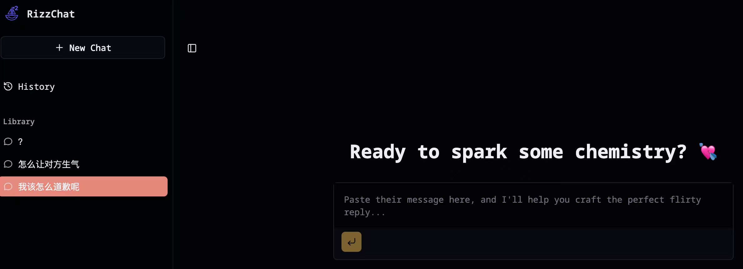 RizzChat is an AI-powered chat assistant that helps you craft perfect flirty, romantic, and witty responses to spark chemistry in any conversation.